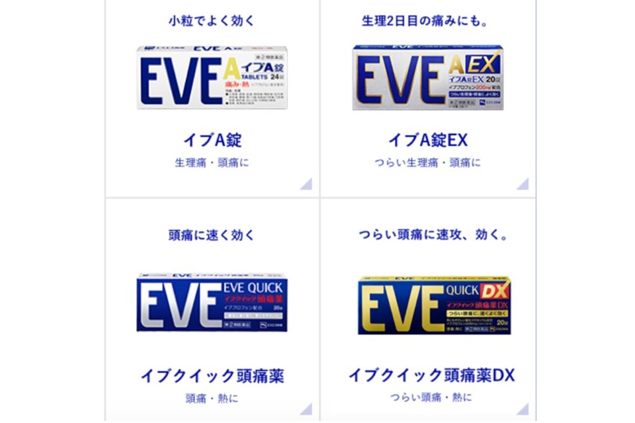 | Eve A Tablets / Eve A Tablets EX | Menstrual cramps / headaches | People who want to relieve pain with easy-to-drink tablets |